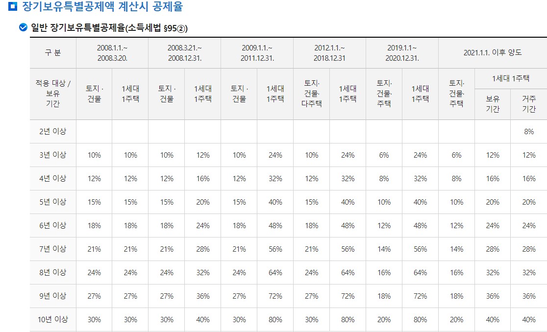 양도소득세 장기보유특별공제는 오랜 기간 부동산을 보유하고 있다가 매도를 하게 되면 장기간 보유했던 기간과 거주기간에 따라서 장기보유특별공제율이 달라집니다.