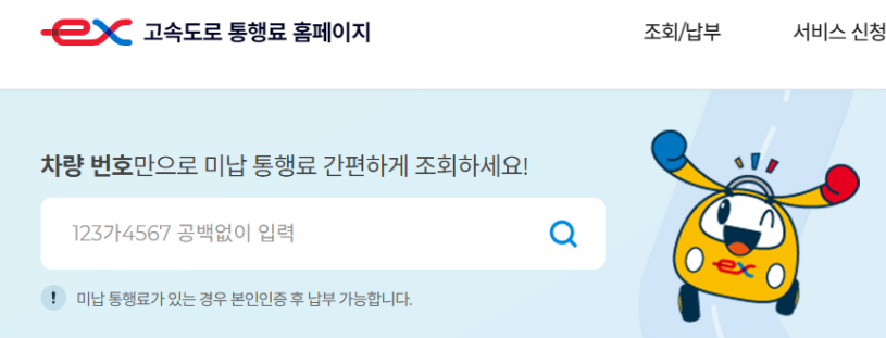 이런 경우 하이패스 미납요금 조회를 통해서 즉시 납부를 해주시며 됩니다. 하이패스 미납내역조회 역시 '고속도로 통행료' 홈페이지에서 조회할 수 있습니다.