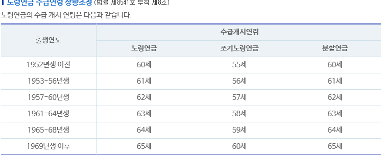 국민연금 수령나이는 연도별로 차이가 있기 때문에 국민연금 공식 홈페이지에서 자세한 국민연금 수령나이를 확인해 보시기 바랍니다.