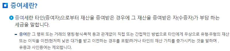 증여세는 타인의 증여에 의해 무상으로 취득한 재산을 과세대상으로 하여 그 재산을 증여받은 자가 부담하게 되는 세금을 말합니다.