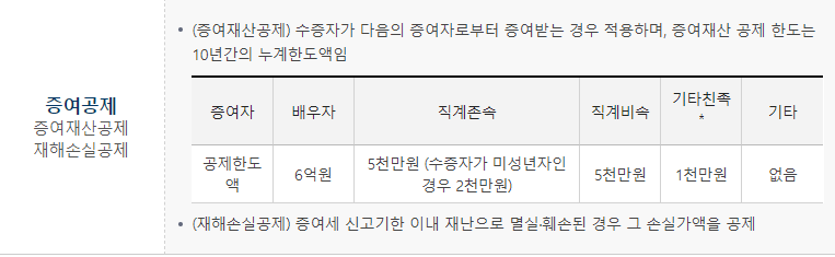 배우자 증여세 면제 한도액으로는 6억 원, 직계존속 5천만 원 (미성년자 자녀 2천만 원), 직계비속 5천만 원이 증여세 면제 한도액입니다.