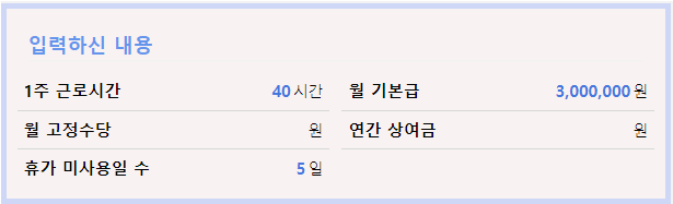 1주 근로시간 40시간, 남은 연차 휴가일수 5일, 기본금 300만 원으로 연차수당을 계산하면 다음과 같습니다. 위의 계산은 연차수당 계산기로 계산한 결과 입니다.
