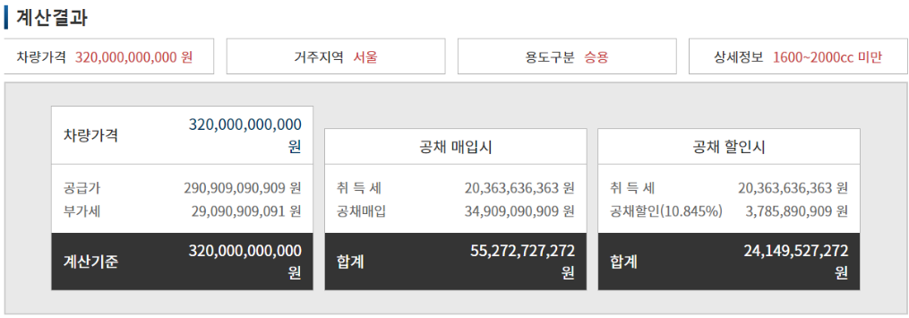 차량 가격을 입력하고 거주지역, 용도구분등 해당하는 항목을 선택하고 계산하기를 클릭하면 자동차 취등록세 계산이 완료됩니다.